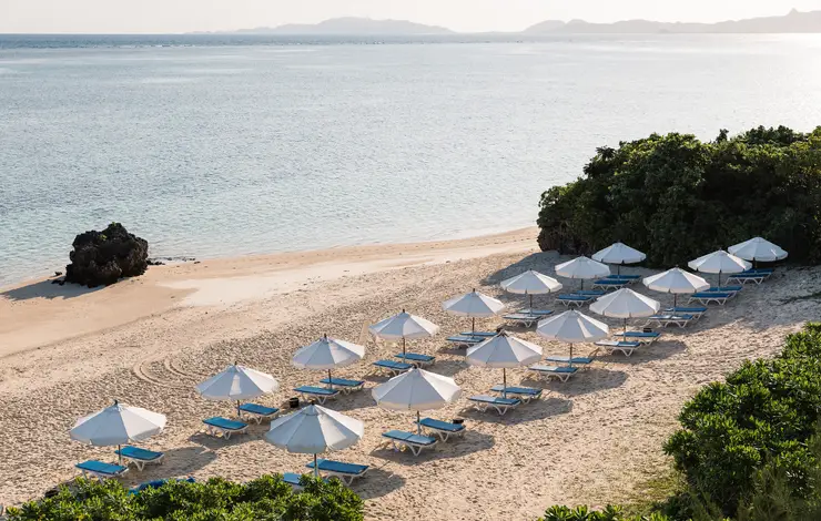 Nestled between tropical forest & white sands, rooms echo the hues of the East China Sea. Wooden balconies & sloping tiled roofs complete the Okinawa design felt in each room.